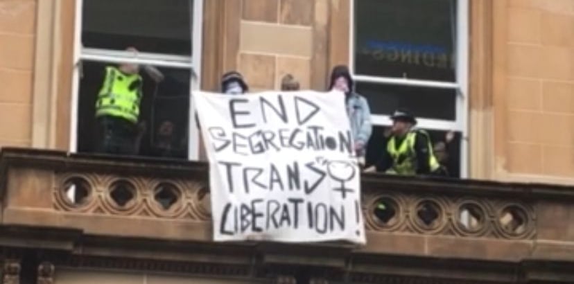 Three masked protesters climbed onto the Equality and Human Rights Commission (EHRC) office ledge in Glasgow to protest an interim guidance set out after a Supreme Court ruling.